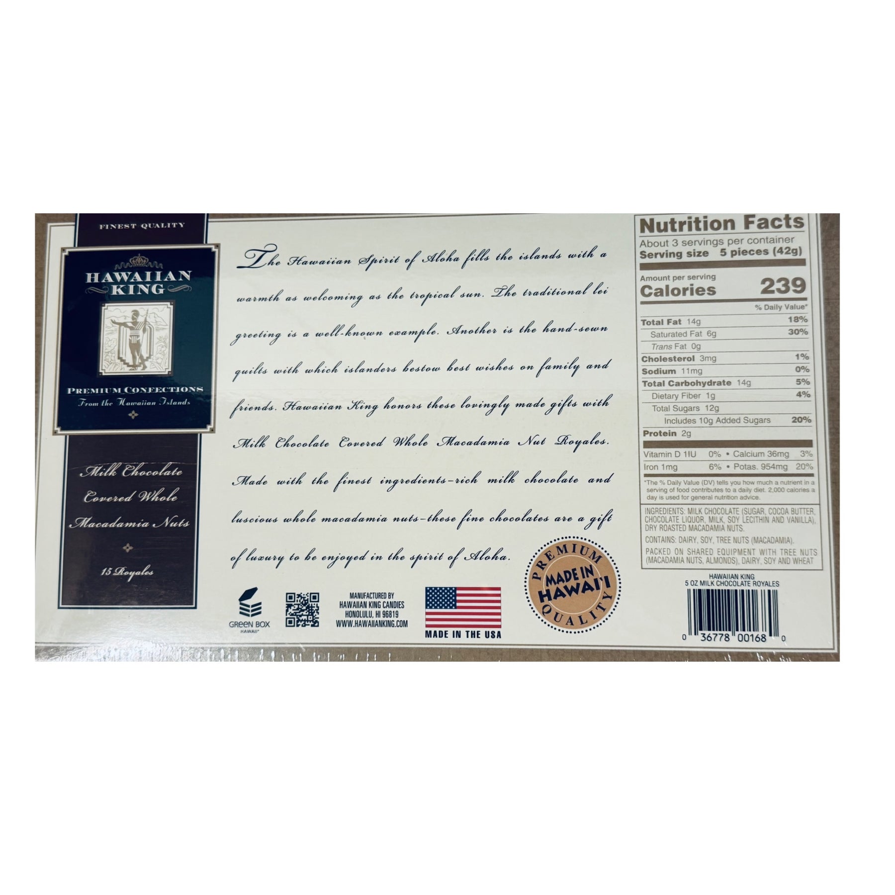 Indulge in a taste of the islands with Hawaiian King’s Milk Chocolate Covered Whole Macadamia Nut Royales. Made in Hawaii, each nut is hand-selected for size and quality, then double-drenched in premium milk chocolate for the ultimate melt-in-your-mouth experience.